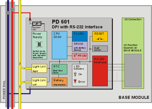 A PD 601 DPI is used to provide local programmable intelligence for the local cluster connected via Light-Link P-NET, and to provide an interface with MODEMs, PCs or other serial equipment, such as printers, bar code readers etc. It uses the BM 003 or BM 011 base module.
