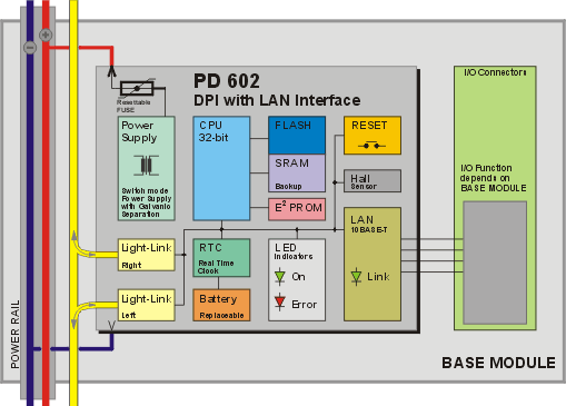 A PD 602 DPI is used to provide programmable intelligence for the local cluster via Light-Link P-NET, and to provide an interface with local area networks (LAN) using the Ethernet electrical standard (10 Mb/s). The BM 016 Base module is recommended for this device.