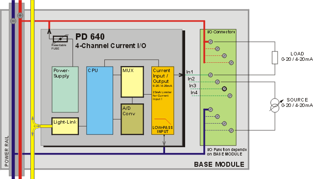 The PD 640 is a general-purpose analogue I/O device with four I/O channels. Channel 1 and 2 may be configured for either input or output. Channel 3 and 4 are input channels. All 4 channels can be independently configured for either 0-20 mA or 4-20 mA signal types. This enables most standard type analogue transmitters for pressure, temperature, flow, etc., to be connected to the input channels, and, for example, analogue actuators, motor controllers, etc, to be connected to the output channels of the device.