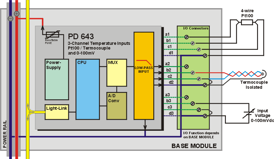 The PD 643 is an analogue input module with one Pt-100/Pt-1000/thermocouple/ 0-100 mV input channel and two thermocouple/0-100 mV input channels. All inputs can be configured for thermocouple/0-100 mV sensor input. A Pt-100 / Pt-1000 temperature sensor can be connected to channel 1 and may be used as a reference temperature for the thermocouple sensors connected to channel 2 and 3. The thermocouple inputs are floating. The PD 643 provides linearization for the following types of thermocouple transducers: Type R, S, B, J, T, E, K and N.