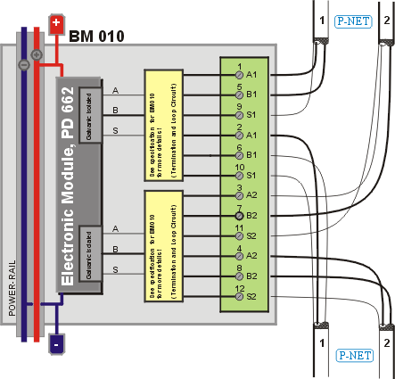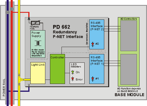 The PD 662 P-NET Redundancy Interface is one of a number of standard modules within the PD 600 series range. Its main purpose is to provide a redundant and transparent link between optical Light-Link and a duplicated RS485 P-NET. The module frequently scans the RS485 communication links to check whether the communication networks are functioning correctly. The PD 662 will ensure that the local cluster of modules (i.e. the group of devices of which the PD 662 itself is a component), will receive data via one of the two RS485 P‑NET ports, and that data from the local cluster will be transmitted to both RS485 P‑NET ports. If, for example, P-NET port 1 is active, and a short circuit or a cable break is detected, the PD 662 will automatically switch to P-NET port 2. The module itself does not require any programming, but a P‑NET slave address and a few other parameters must be configured. The PD 662 is used with a BM 010 base module.