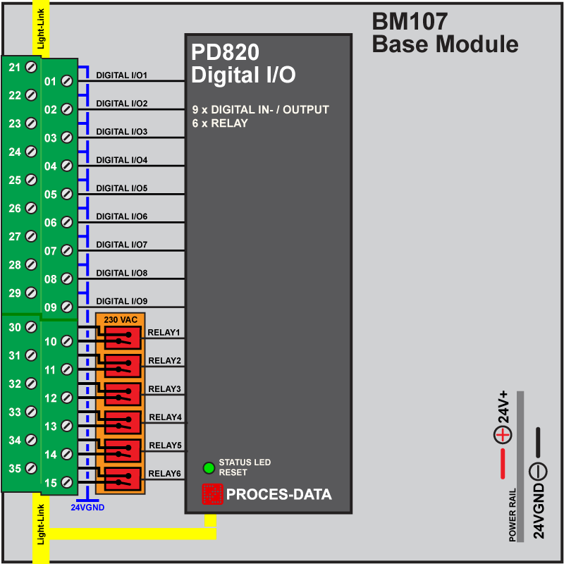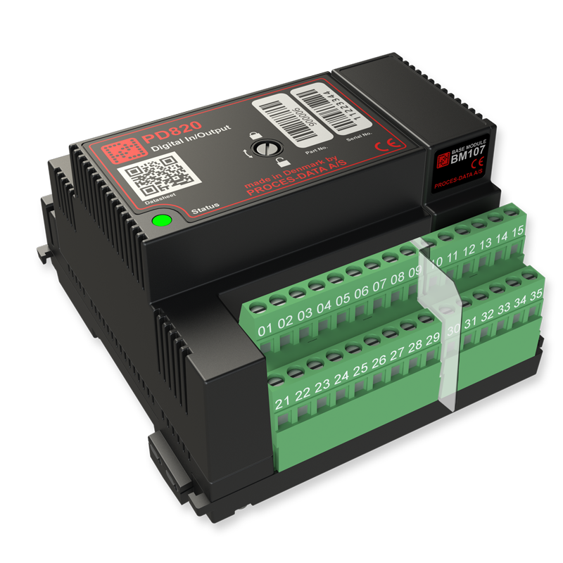 PD 820 can alternatively be used with the BM 107 base module that also provides a separate terminal block for connections to relays. This will enable the PD 820 to use 9 digital inputs/outputs and 6 individual potential free relay outputs.
