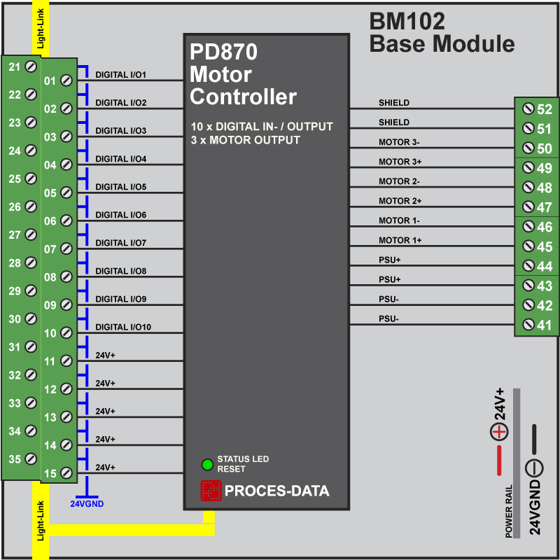 PD 870 is used with the BM 102 base module that provides the I/O terminals, power supply connection and P-NET light-link communication interface, and power output.